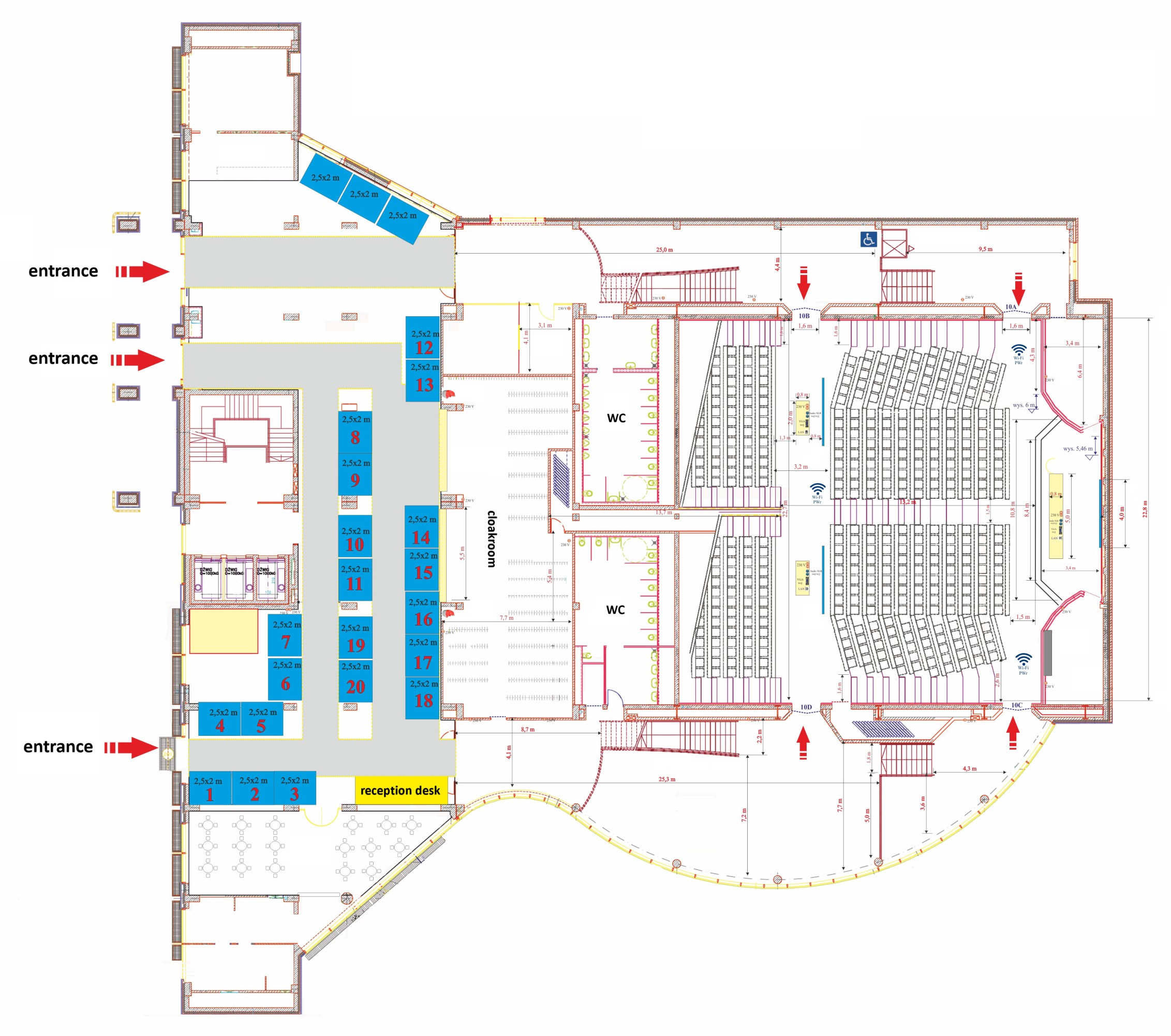 The conference will take place in the Wrocław University of Technology conference center, where the exhibition booths will be present for the first three days of the conference (1st to 3rd July 2013). The map presents a tentative location of the booths with respect to the conference room.