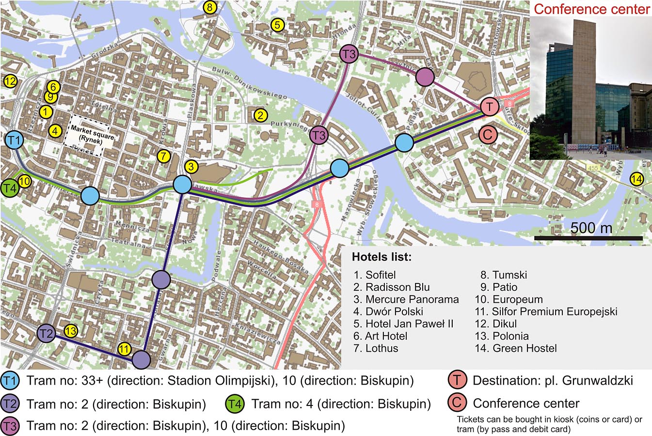 Wrocław–Copernicus Airport (link: http://airport.wroclaw.pl/en) is placed inside the city, 12.5km = 7.5mi away from the Market Square (“Rynek”) around which most hotels are located. The most convenient way to get from the airport to the hotels is by taxi; this should cost about 50 PLN = 12 EUR. There is also daily bus No. 406, which however requires change to another bus (No. 132 or 142) or tram (No. 23 or 31PLUS) to get to Rynek.Hotels ⇔ Venue